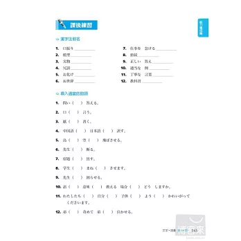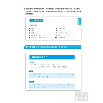 ◆ 「課後練習題」:每一課皆附有非選擇題形式的練習題,有效檢測日語書寫能力及各課學習成效。