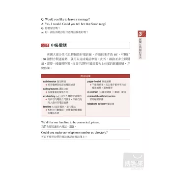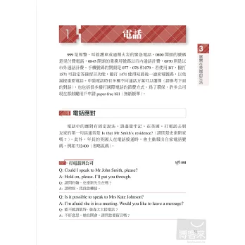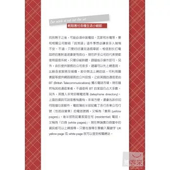 本書最大的特點就是針對居住英國可能遇到與生活相關的議題,給讀者提供了詳細周全的字彙及情境關鍵句。本書第一章就特別提醒讀者英式英語中的禮貌用語,在日常生活中,我們若能使用正確合宜的英語與人溝通,必可維持和諧的人際關係。個人觀察到英國父母會隨時提醒小孩要說please,因此在英國社會中僅回答yes/no是不夠禮貌的,後面可以加個please,例如yes, please或no, please。乘坐大眾交通工具,下車時,若旁邊有人,一定要先跟對方說聲Excuse me然後再站起來,準備下車,這樣才不會失禮。使用本書,讀者會學習到很多英式用語,跟我們所認知的美式英語不一樣,例如大學生宿舍不是大家熟悉的dormitory,而是hall of residence;英國大學校長則多稱為Vice Chancellor,很少用President這個頭銜。有關英式英語(簡稱BrE)與美式英語 (AmE) 之差異,讀者也可以瀏覽這個網站:www.woodlands-junior.kent.sch.uk/customs/questions/americanbritish.html。但本書附錄中的對照表,選擇的字彙更實用,更易於參考查詢。