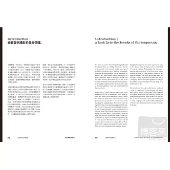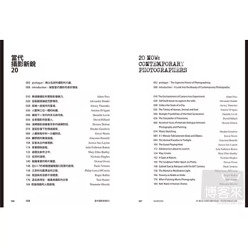 這應該就是攝影的力量吧!它是記憶碎片的實體,是時與空的鏡子。有人為了紀錄查訪而進入文明的邊境,有人為了藝術創作、表達自我而雕琢構圖堆砌場景,有人試圖捕捉所有正在流逝消失的呼吸氣息。謹以此書,引介當代二十歲至六十歲間,正在國際攝影界活躍的攝影師二十位,和不斷追求技、器、藝的究極,探尋深奧幽玄與人生真義的人們共勉。