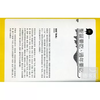 作者既戴四方帽,也曾戴廚師帽;受過廚藝專業訓練,也受社會理論思維影響。廚房與社會看似兩個世界,卻讓作者走出一條過道。飲食作為一種社會行為,不論從食材的分類、採購、處理,到烹調、享用、評價等過程,都受到所置身的集體「遊戲規則」所限。是誰規定吃和牛蘸燒汁是品味表現?是誰告訴你吃buffet一定有著數?鳳爪本身無肉無味為何我們仍啃得津津有味?「狗肉該不該吃」的討論與「全球大趨勢下誰是王者」的立論又有何關係?飲食行為其實隱藏大量訊息,讓人思考個體在社會中的際遇與位置,洞悉這些問題,便知道如何切斷那條牽著你鼻子走的繩。