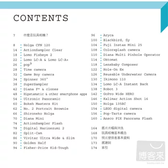 本書中將會介紹40種你可以了解並根據其特性來掌控的玩具相機。藉由呈現每台相機的獨特影像,《我愛玩具相機:40種必敗玩具相機的寫真創意力》提供了讀者對時下最熱門的玩具相機詳細的需知資訊,絕對會讓人徹底陷入這些便宜、古怪又讓人愛不釋手的玩具相機世界。