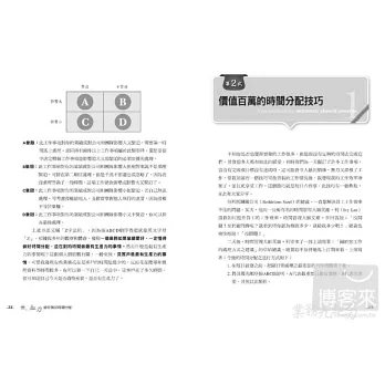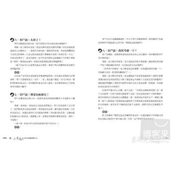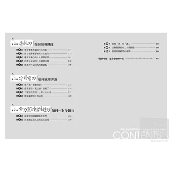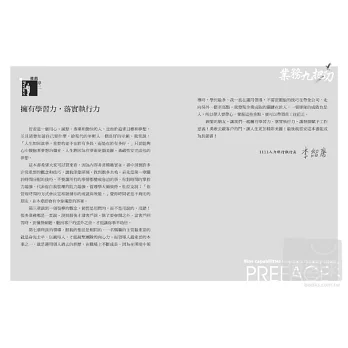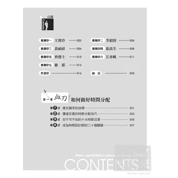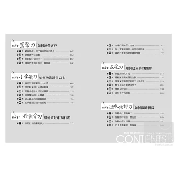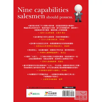 整本書的架構,並不是只有談到銷售,因為一個業務員除了要會把話說出去,把錢收回來外,還要懂得如何運用行銷的力量讓你借力使力不費力,如何做好時間分配讓你每分每秒做最有生產力的事,如何做好客戶管理,因為認識人了解人你將無所不能,如何運用一對多銷售,讓你用最少的時間拜訪最多的客戶,除非你一輩子只願意做一個單打獨鬥的業務員,或者只願意用自己的時間在賺錢,否則你要學習如何建立夢幻團隊來倍增績效,如何激勵團隊和領導團隊來共創未來,內容豐富多元,實務有效,難得可貴,物超所值,是每位業務必備的武功秘笈。
