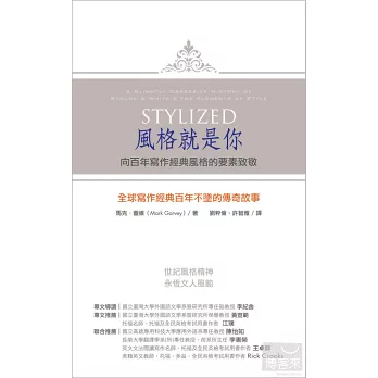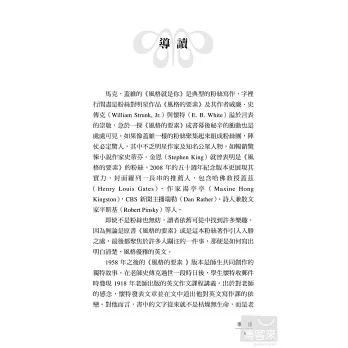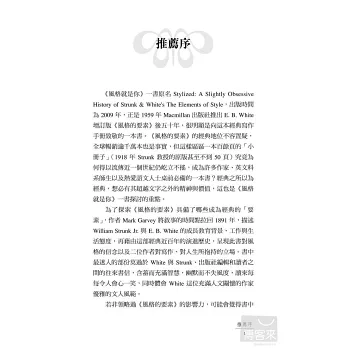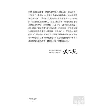 若非領略過《風格的要素》的影響力,可能會覺得書中對於《風格的要素》精髓的解釋過於小題大作、牽強附會,但畢竟「文如其人」,表現形式或許可以倣效,精神與本質卻是獨一無二。知英文化找我為本書寫序推薦的這一段時間,正逢蘋果電腦創辦人 Steve Jobs 辭世,新聞媒體爭相報導他的出生背景、求學歷程、人格特質,甚至是人生態度,如何造就了他絕無僅有的產品風格。由此看來,便不難了解為什麼連許多藝術界、設計界、科學界的人士都推崇《風格的要素》這本書。無論有沒有讀過《風格的要素》,無論創作領域為何,這本《風格就是你》都是值得推薦的一本書,透過風格大師的故事,體會為什麼「風格就是你」。