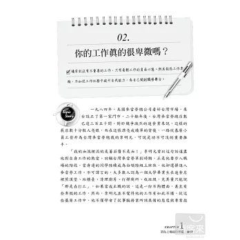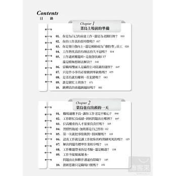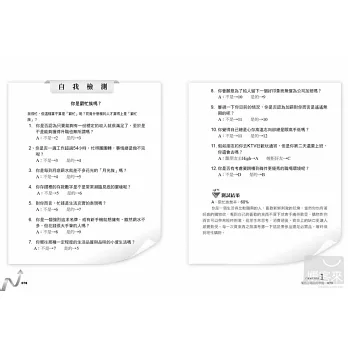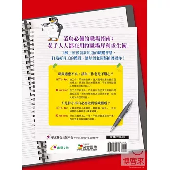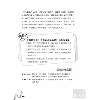 3.搭配「職場潛規則」點破職場開竅的Keypoint ;「自我檢測」讓你更了解你自己;「職場學習Tips」「To Do」「Not To Do 」的加分關鍵,提供讀者立即可應用的行動指南。