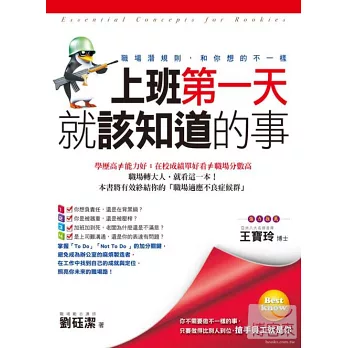 本書針對即將進入職場和初入職場的上班族會面臨到的職場適應不良症一一點出,告訴你上班後就該知道的職場智慧,並提出有針對性的建議,除了導正應有的敬業態度與工作方法,還教大家如何做好職場個人管理、培養高效能的工作效率及職場EQ;如何面對職場競爭,運用職場人際關係法則,掌握策略,與他人有效合作,如何與上司、同事和平共處,如何紓解工作壓力、被罵情緒的處理,工作時間分配管理,如何建立個人內外形與口碑,讓上司看到你的價值等………提供了解決之道,幫助職場人在工作中找到自己的成就與定位,工作愉快、順利升遷。推薦給初入職場的社會新鮮人閱讀。