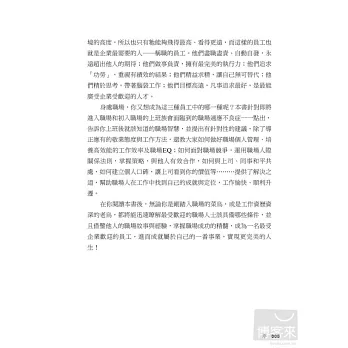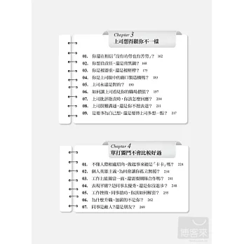 1.本書共分五章分別從「上場前的準備」、「工作技能的提升」、「與上司的互動」、「和同事 的競合」、「提升個人職場價值」。點出現代人職場生存之道,學會打造好員工的體質,快速晉升成主管的頭號愛將。