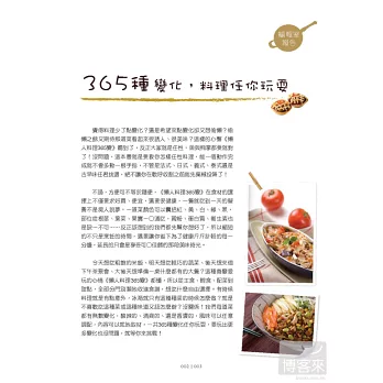 ◎50道手作美食365種變化:自由主食8→53,5色蔬果一次到位;任意輕食10→78,百變捲捲包包吃飽又吃巧;懶人好菜22→160,簡單步驟做菜好輕鬆;樂活點心10→68,好看甜點美味不費力。