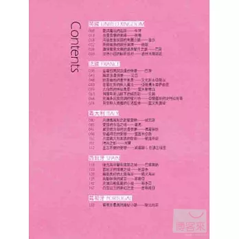本書為「愛」精選50個歐洲城市,提供豐富而多元的兩人世界的選擇,可能是知名度極高的景點、也可能是不為人知的私房推薦,無論是絕美如詩的景致,或者豐富的人文風情,都將成為一輩子難忘的如夢記憶。所謂的蜜月,不僅是指已婚的新人,也是相愛的戀人,透過本書,歐洲不再遙不可及,Kevin將帶領讀者造訪每一個充滿愛戀氣息的角落,讓戀人們時時刻刻停留在相愛的瞬間。
