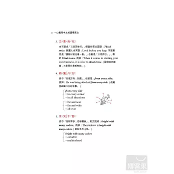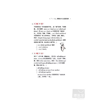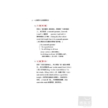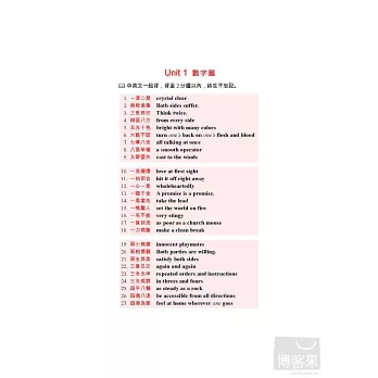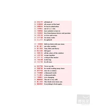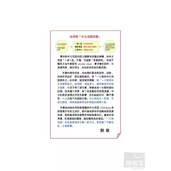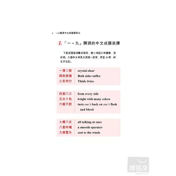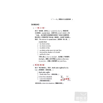 書中對中文成語和英文翻譯有詳盡的解釋,如中文成語「一清二楚」不懂,可查閱「背景說明」,如果不懂英文為什麼要用crystal clear,書中會告訴你,它是慣用語,固定用法,也告訴你其他同義成語。