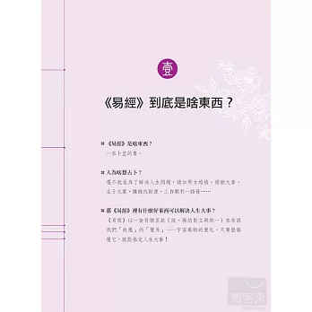 千年智慧,現代解讀,跳Tone呈現──看圖說故事,易經好好玩!市面上有漫畫《易經》,圖案依舊是老舊中國式人物?本書漫畫非常現代、超級樸拙,簡單中趣味橫生,輕易從中了解流傳數千年的宇宙定律;解釋《易經》總是靠講古?本書融合時事,親切不八股;漫畫圖解384爻的內容實在太有趣,連孔老夫子都忍不住想拍桌叫好!