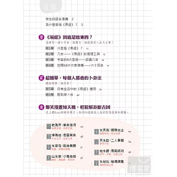 易經64卦,每一卦又有6個爻,總共有384個爻,就有384張素人手繪漫畫誠心大放送!超kuso的劇情、超無厘頭的對話,讓你跟著情境了解爻辭,下次再有人你抱怨:「易經好難喔!」你就可以驕傲地大聲說:「哪會,易經很簡單!」