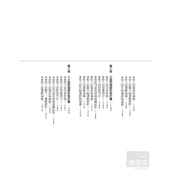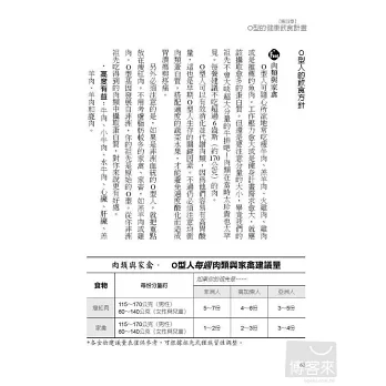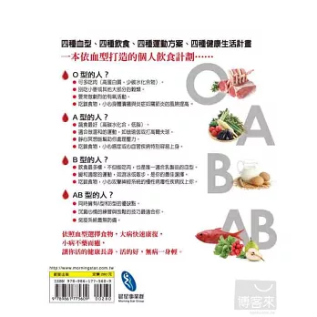 Part 2「各種血型的健康計畫」,分別介紹O、A、B、AB四種血型適合的飲食計畫,針對不同血型特質列舉對不同血型有益和避免食用的食物,以清楚、簡單、人人都可遵守的生活守則,協助每個人保持身體最佳狀態與理想體重。
