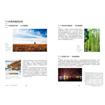 本書透過深入淺出的講解方式,幫助你詳細了解數位攝影構圖的基礎知識與形式,並且著重講解了風景攝影、人像攝影以及生態攝影中對各種構圖方式的靈活運用,每一種構圖方式的介紹都結合圖片實例,讓你一目了然。