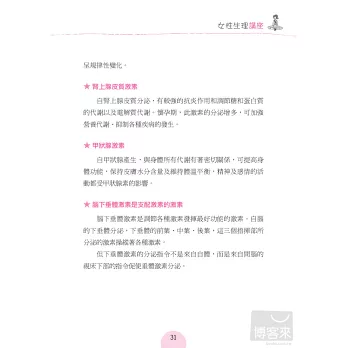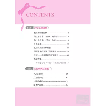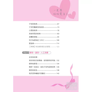 相信每個女性在自己的成長過程中,必定曾經遇到過許多令人惶恐、卻又羞於啟齒的生理問題。瞭解身體結構及相關的疾病防治,將能讓妳對於生理期、懷孕、生產及避孕有正確的認知。