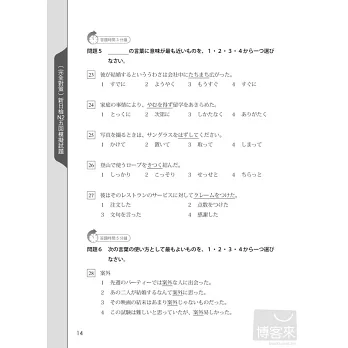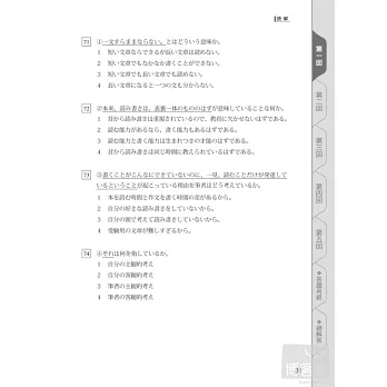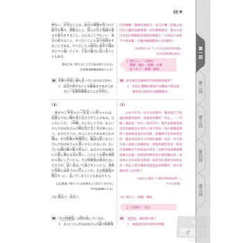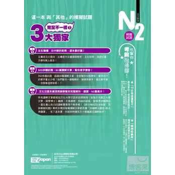 並且,讀者其實可以把本書視為「讀解訓練教材」。因為《新日檢N2完全對策:5回模擬試題》每篇讀解文章都具備「詳細標注讀音+最高水準翻譯」。只要勤於閱讀本書,相當於擁有五十幾篇最佳讀解教材!帶您輕鬆攻克新制日檢讀解!!