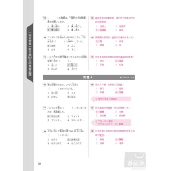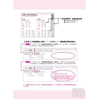 「10日快速複習卡」收錄全書「重點題型」和「例題」。讓考生能夠把握最後衝刺時刻,快速掌握應考要點。本書並特別加贈具備視覺隱形功能的隨身收納夾,不僅讓考生能夠隨身攜帶,更能讓中文翻譯和題型解答隱形。考前衝刺必備!!新制日檢強制取分!