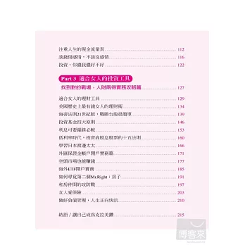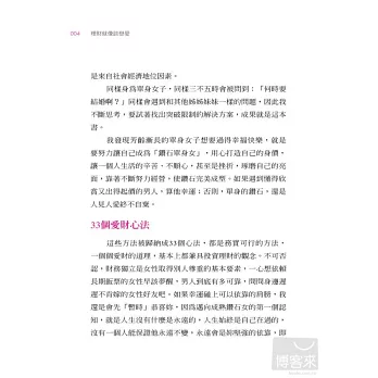 身為女性,作者將女性朋友可能面臨到的感情和金錢問題,提出一些不同的看法與見解,並以簡單、有趣且實際可行的方式,幫助大家走出理財與愛情的迷霧森林,開創出更璀璨亮麗的人生。