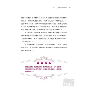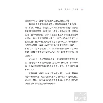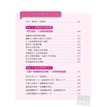 本書教妳如何選對投資標的、如何選擇真命天子。因為兩者道理都相通,不必學一堆艱澀難懂的投資理論,或似是而非的兩性理論,只要跟著本書所規劃的三步驟,讓自己在金錢與愛情上都能得到自主權,就能讓變成人見人愛的黃金鑽石女。
