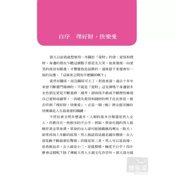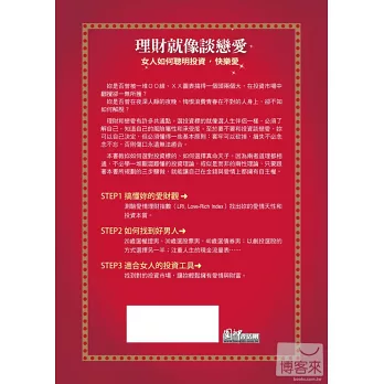 本書是專為女人寫的理財書,但卻又不是一本完完全全的理財書。以創新的觀點,從愛情的角度切入,幫助更多人能了解如何管理金錢,如何談好戀愛。令人驚訝的是,原來理財和愛情道理都一樣,而且還可以互通。