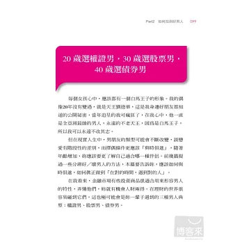 20歲選權證男,30歲選股票男,40歲選債券男;以創投選股的方式選擇另一半;注重人生的現金流量表……