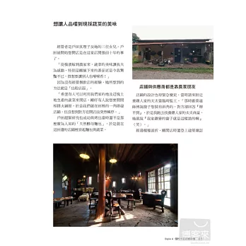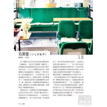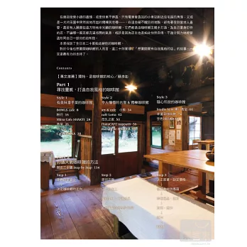 推開咖啡館的大門,邀請讀者一起走進:已有八十年歷史的木造懷舊咖啡館,每星期只營業一天、屋齡三百年的古厝咖啡館,還有開放自用住宅一隅、每星期只營業三天的咖啡館,以及供應店門前田地現採蔬菜及自家烘培麵包的咖啡館,二十多歲年輕人開設的小小藝廊咖啡館,附設淋浴間與置物櫃、支持「健康」與「夢想」的咖啡館……
