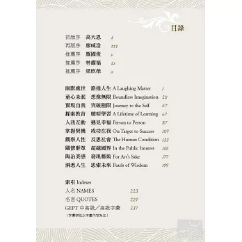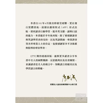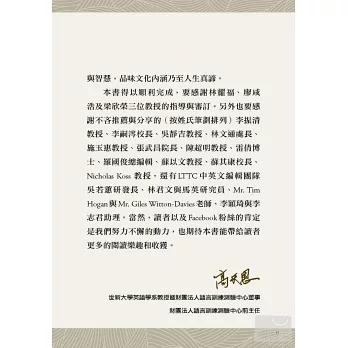 本書得以順利完成,要感謝(按姓氏筆劃排列)林耀福、梁欣榮及廖咸浩三位教授的指導與審訂。另外也要感謝不吝推薦與分享的(按姓氏筆劃排列)李振清教授、李嗣涔校長、吳靜吉教授、林文通處長、施玉惠教授、康士林(Nicholas Koss)教授、張武昌院長、陳超明教授、雷倩博士、蘇以文教授、蘇其康校長,還有LTTC中英文編輯團隊吳若蕙研發長、林君文與馬英研究員、Mr. Tim Hogan與Mr. Giles Witton-Davies老師、李穎琦與李志君助理。當然,讀者以及Facebook粉絲的肯定是我們努力不懈的動力,也期待本書能帶給讀者更多的閱讀樂趣和收獲。