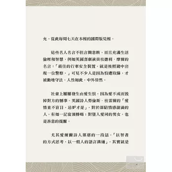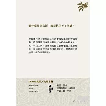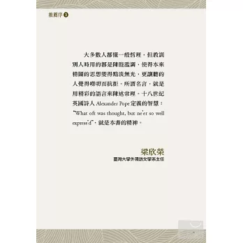 本書精選國際知名人士的英語名言100則,分成10個生活智慧篇章,從幽默到想像、勵志到成功、個人到全世界,一字一句都值得再三推敲與細細品味,希望帶領讀者欣賞優雅英文、修辭之美,同時體會新的人生智慧。