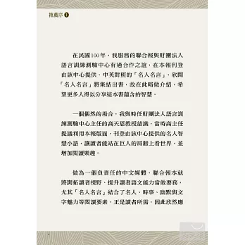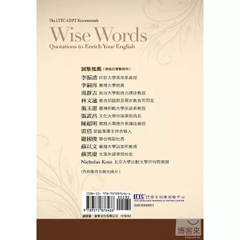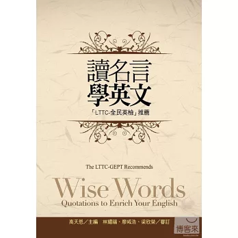 財團法人語言訓練測驗中心(LTTC)長期耕耘外語教育與測驗,致力於落實「終身學習」的教育理念。為結合英語與文化學習,我們從民國100年起以各式專欄提供學習資源。其中,在《聯合報》總編輯羅國俊的邀請下,LTTC為該報國際版製作了「名人名言」專欄。LTTC十分珍視此一難得版面,精挑名人妙語格言,譯成中文,並佐以中英文闡述。本專欄於報上刊登了半年,之後並於LTTC Facebook上持續刊登,廣受教師、學生、專業譯者等各界的好評,引起廣大迴響,我們因此決定將專欄內容集結成《讀名言 學英文》一書,以饗讀者。為便利讀者閱讀,本書精選100篇名人格言,以貼近生活體驗的方式分成10個篇章,並提供文中相當「全民英檢」中高級、高級的字彙解釋,以及聲音檔光碟片,幫助讀者提升英文聽、讀能力,並透過名人的詼諧與智慧,品味文化內涵乃至人生真諦。