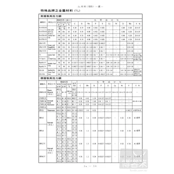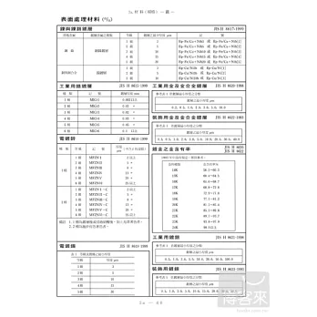 鐵及鋼之新舊 JIS 對照表(隨應 SI 單位JIS 之新記號) / 鐵及鋼之 JIS 規格 / JIS 不?鋼之概略組成、性質、用途 / 鐵及鋼之美國規格 / 特殊品牌之金屬材料 / 表面處理材料