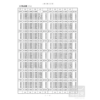 求平面圖形之面積 / 立體之體積及各種數值 / 弧長、弧高、弦長及弓形之面積 / 等分圓周之弦長 / 與圓內切之圓、正多角形之內切圓及外切圓 / 三角函數 / 數之常用對數 / 數之自然對數 / 弧角度 / 關於 π, g, e 之重要數值 / JIS 標準數
