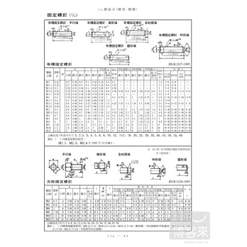 六角螺栓 / 方頭螺栓及滾軋花紋 / 六角承窩螺栓 / 螺栓孔和魚眼座直徑 / 螺紋端之形狀尺寸 / 平頭螺栓 / 六角螺帽 / 六角小形螺帽、方螺帽 / 有槽六角螺帽 / 六角杯形螺帽 / 滾動軸承用鎖緊螺帽、墊圈及鎖緊墊圈 / 螺樁 / 牙攻深度、攻螺紋深度 / 螺紋套孔 / T 槽螺栓 / T 槽螺帽、T 形槽 / 基礎螺栓 / 鉸接螺栓、敲擊螺栓 / 環首螺栓 / 環首螺帽 / 蝶形螺栓 / 蝶形螺帽 / U 形螺栓 / 墊圈 / 固定螺釘 / 有槽小螺釘 / 有槽小螺釘(沒有列入 ISO 者) / 十字孔頭小螺釘 / 十字孔頭小螺釘(沒有列入 ISO 者) / 自攻螺釘 / 直銷 / 對邊寬度之尺寸 / 分解工具 / 扣環