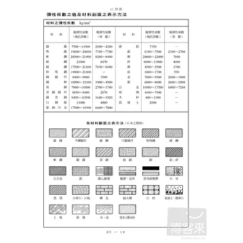 地震之負載計算基準 / 積雪之負載計算基準 / 風壓之負載計算基準 / 風之強度基準 / 關於地震之基準 / 噪音、震動之管制標準 / 起重機移動鋼桁構造部分之計算基準 / 貨物裝載界限與貨車尺寸 / 熱膨脹係數 / 比熱 / 變態點及變態熱 / 比重之常用值 / 摩擦係數 / 彈性係數之值及材料剖面之表示方法 / 滾動軸承之損傷 / 反復疲勞之破斷面及其原因 / 硬度換算表 / 各種線號規格比較表 / 規格名 / 國際原子量表
