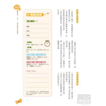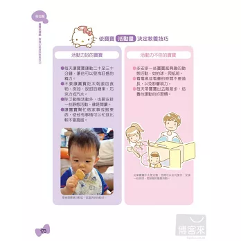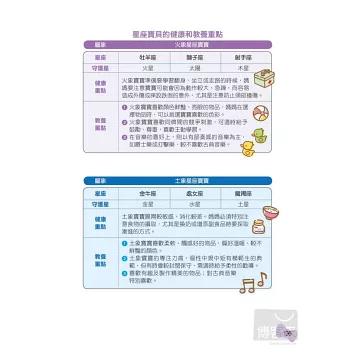 【主題明確】:章節主題明確,0-12個月寶寶的成長&發育重點、照顧技巧、副食品製作法、啟蒙遊戲、星座個性、常見疾病&意外、新生兒餵藥技巧…等。