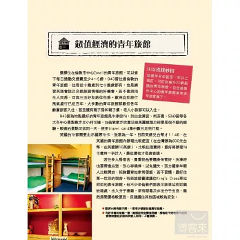 943幫大家精選步行就能抵達各大熱門景點的大學假期宿舍和青年旅館,講華語也能通的英式洋房華人民宿,及4種免費住倫敦的秘招。本書更獨家全方位評選比較13個住宿方案的食宿與交通,讓你一目了然最適合自己的省錢住宿,不怕省了住宿卻得多花交通費。
