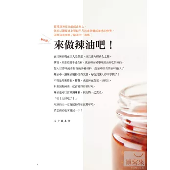 快翻開這本書,一起走進深奧而簡單、豐富又美味的辣油世界吧!