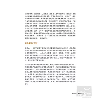 本書是破除大多數人對於簡報功能迷失的第一本書,重點在於講者本身是否能與觀眾產生簡報主題上的連結,而非華麗酷炫但言之無物的投影片。