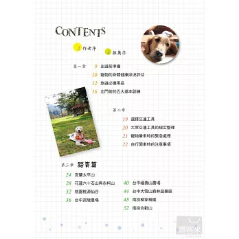 帶狗狗出門旅行不麻煩,不論是狗狗的健康狀況評估、旅行用品的準備,還是交通工具的選擇與緊急事故的應變處理方法,我們通通都幫你準備好了。