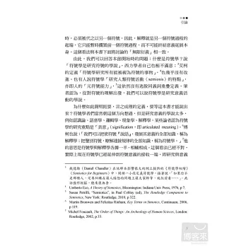 本書將涉及的許多重要概念,例如意義、系統、象徵、文化、藝術、美、意識形態,都苦於定義太多太複雜,唯獨符號與符號學卻幾乎沒有定義。西方著作給「符號學」的定義一般都是:「符號學是研究符號的學說」(Semiotics is the study of signs)。這很難說是定義,在中文裡是同詞反覆;在西文中,只是在解釋semiotics 這個希臘詞根僻詞是什麼意思,如果能說清什麼是符號,勉強還算一個定義。