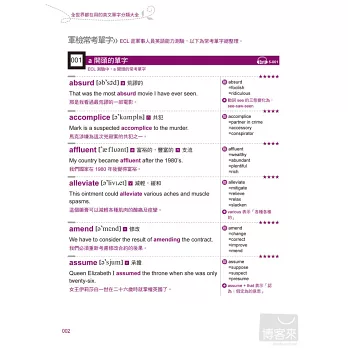 獨家收錄「ECL軍事英文檢定測驗常考單字」;臨時抱佛腳必看的文法速讀筆記及常見字首、字根、字尾速記表。