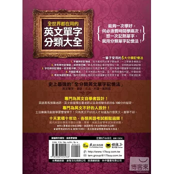 史上最強的「全分類英文單字記憶法」,共分五大篇,利用字形、字義辨析等方式背單字,適用於ECL軍檢、全民英檢、新多益、雅思、國家考試及各類英語檢定考。