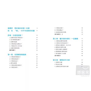 此外,本書在每一章的最後還附上實作題,讓你自己做做看。只要完成這些練習,不但能輕鬆理解記帳的概念,讓你從存錢、接下來編製各類財務報表,理財規劃、投資……都輕鬆完成、難不倒你。
