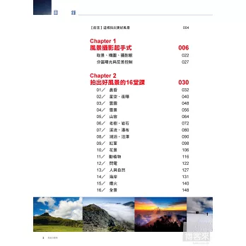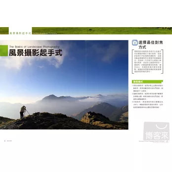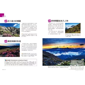 這本書的前身— 《這樣拍出好風景》於2010年3月出版,是從初學者的角度切入,將多年來的拍攝經驗與心得整理跟大家分享。在風景攝影實戰方面,我用山岳豐富的攝影題材挑選了十三個最受歡迎的風景攝影主題分析教學,引起了眾多愛好者的關注和支持鼓勵。