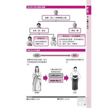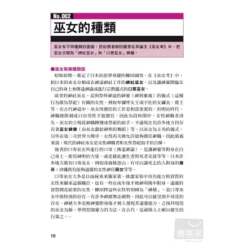 據日本民俗學的先驅,柳田國男的《巫女考》的看法,巫女可以分類成在神社工作的神社巫女和以降靈來進行口寄(傳達神諭)的口寄巫女兩種。後者還可以細分為憑依巫女與神姥。此外,世界各地的通靈系統中,都同樣存在著讓神靈等附身,可以稱為巫女的女性祭司。本書首先會介紹現代的神社巫女,之後依序介紹神道、神社、巫女的歷史、日本與世界上的巫女。