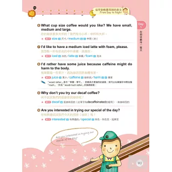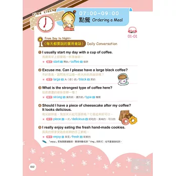 學會話的同時,別忘了掌握句中的關鍵單字。書中每句會話下方都列出2-3個重點單字,清楚標註詞性及中文解釋。熟記並活用這些單字,英語能力將加倍提升。