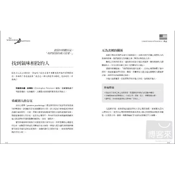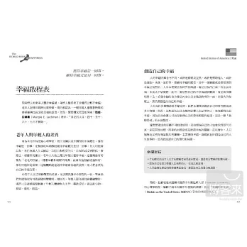 102位來自世界各地的正向心理學頂尖專家,從時間、健康、成功、幸福感、未來、同感、遺傳學、自由意志、幽默感、痛苦、選擇、家庭、朋友等各面向,跟讀者分享發現快樂及維持快樂的最佳妙方。