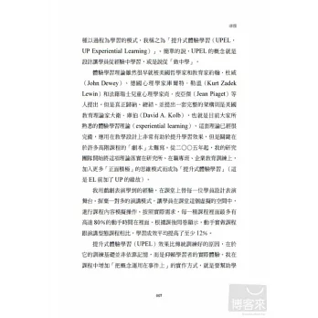 體驗學習理論雖然很早就被美國哲學家和教育家約翰.杜威(John Dewey)、德國心理學家庫爾特.勒溫(Kurt Zadek Lewin)和法籍瑞士兒童心理學家尚.皮亞傑(Jean Piaget)等人提出。但是真正歸納、總結、並提出一套完整的架構則是美國教育理論家大衛.庫伯(David A. Kolb),也就是目前大家所熟悉的體驗學習理論(experiential learning)。這套理論已經很完備,應用在教學設計上非常有助於提升學習效果,但是關鍵在於許多高階課程的「劇本」太難寫。從二○○五年起,我的研究團隊開始將這項理論落實在研究所、在職專班、企業教育訓練上,加入更多「正面積極」的思維模式而成為「提升式體驗學習」(這是EL前加了UP的緣故)。