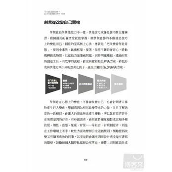 本書主要分作兩大部份,前半部為養成「創意體質」的內功心法,由自覺展開,察覺最適合自己的學習風格,並學習如何轉化不同「位置」,以看、聽、模仿、及各種場景演練,發現各種習以為常的事務的不同可能。後半部份則進入到技術層面,以不同案例進行說明與創意實作,讓讀者更能理解如何真正運用創意解決工作上與生活上的大小問題。每章案例與實作題目都沒有絕對的標準答案,不只是可以讓單一讀者進行練習使用,亦可用於企業人資部門進行教育訓練的課程,是一本可以一人使用,也可以多人共學的創意書!