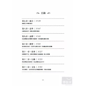 〈意外〉是在講一個概念:每次的出錯是給自己一個跳出框架的機會,決定要不要跳出去,關鍵還是在於自己的想法。因此把握每次出錯,用正面積極的態度處理,你可以當作又是一次「出錯」,也可以把這次看成是「機會」。講〈品牌〉的書很多,可是我自己覺得品牌沒這麼複雜,好品牌應該是用實際行動展現,而非僅靠炫麗的外觀。在這裡,我們多花了一些篇幅解釋大腦有多麼粗心,還有印象有多麼的不可靠,作設計的朋友請別錯過。對於〈簡單〉這一章,本來我想來一個超大跨頁,然後上面印四個小字「簡單是美」,但是想一想這種「無字真經」等級 的譬喻,大家一定很難接受……要讓創意變簡單,要從簡單中發展創意,這一章正好有一個不錯的工具。我將近百種跟簡單有關的案例整理、歸納,產生出九個重要元素:時間、組織化、感動、強化功能、捨去、感染、明確的理由、差異化以及安全感。交錯、選擇性運用這九種元素與法則,可找出將複雜事物發展濃縮成簡單的方式。