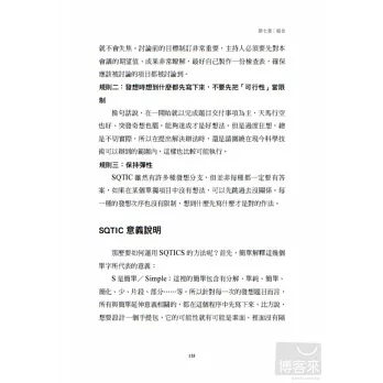 第四章到第十章提供給讀者知識上、能力上的改造,如同任何事都非絕對,每一章可能知識性多,也可能偏重能力養成,但是每個主題都與刺激各位創造有關。〈混亂〉這一章講的是混亂與出錯經常產生創意,適時的將錯誤轉化為獨特見解,就是好的創意。〈溝通〉我們談到是如何將腦裡想的事有效率傳遞給對方,為了讓傳遞被接受,傳遞者要多下點功夫。在這一章裡面,感同身受以及角色投射這兩部分,讀者們別錯過了,你會發現溝通的重點,是仔細聽,而不是用心說。〈分解〉是最多人創新的方式,包括知名的上市櫃公司,都利用這巧妙的手法快速生成創意。分解能把別人的流程或功能拆解成小塊,再拿一些運用在自己身上的,只要多下功夫觀察,你會發現這一招非常好用。〈組合〉是很有趣的一章,除了分享幾個有趣的組合應用案例外,大家一定要把書中SQTIC這套思考工具學起來,當你實在擠不出想法時,這工具能幫你度過難關。