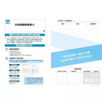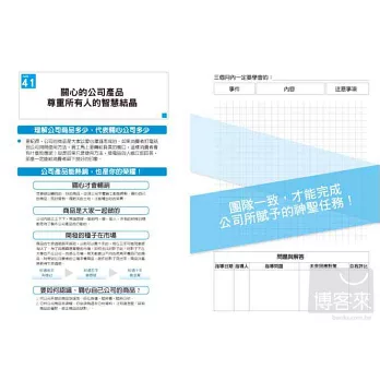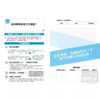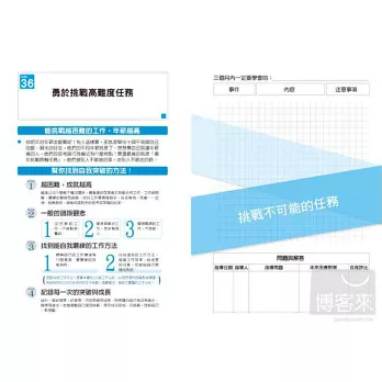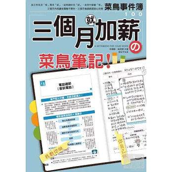 《三個月就加薪,菜鳥筆記》有「磨練技術及修練精神」的「工作法則100條」,每條法則都留有一頁的篇幅,讓你寫下學習經驗,經過不斷的紀錄、分析、找出問題,尋求因應對策、再學習這樣的循環。只要三個月特訓,就可以改變職場新人的命運,提升職場新人一生的氣運!